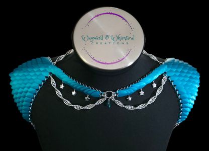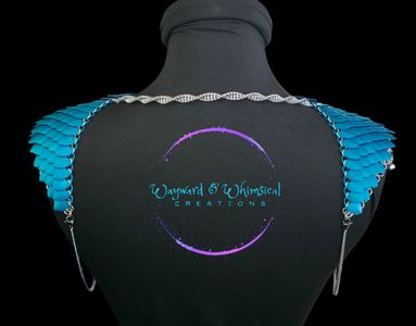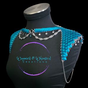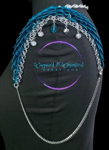 Small scale epaulettes. Perfect for cosplay, ren faire, or your next music festival. Made from high quality aluminum jump rings and premium scales. Featuring crystal glass beads.
